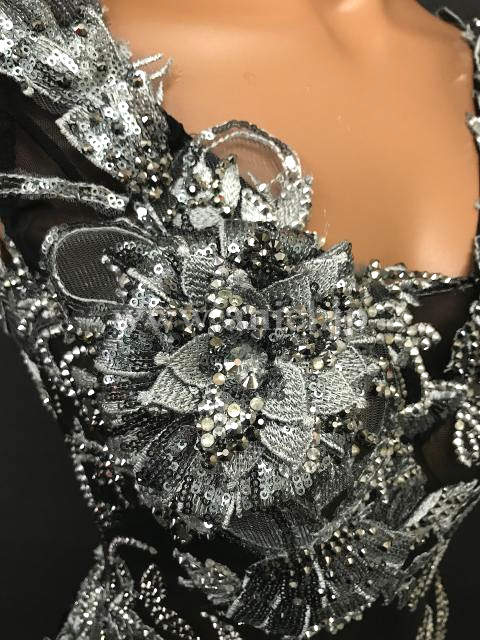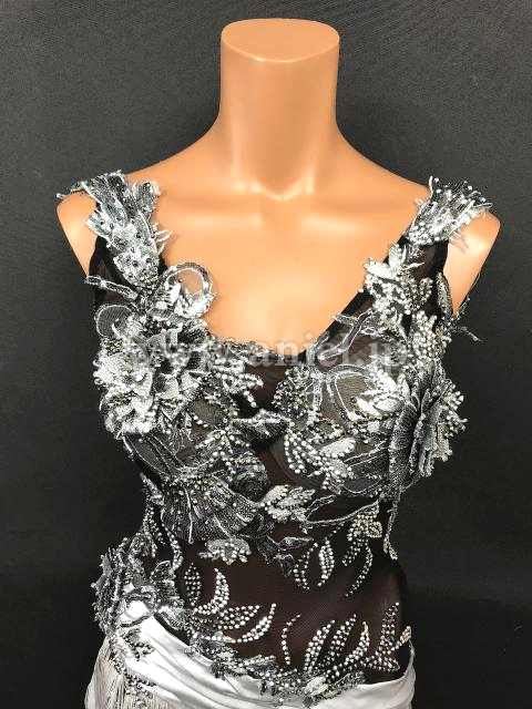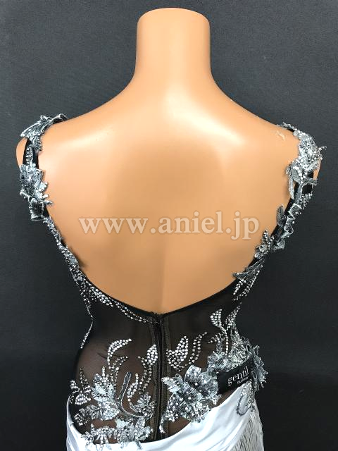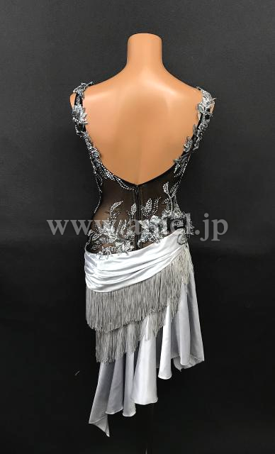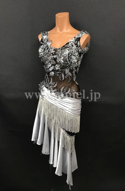 黒のシースルー生地にシルバーサテンの生地がエレガントなラテンドレスです。