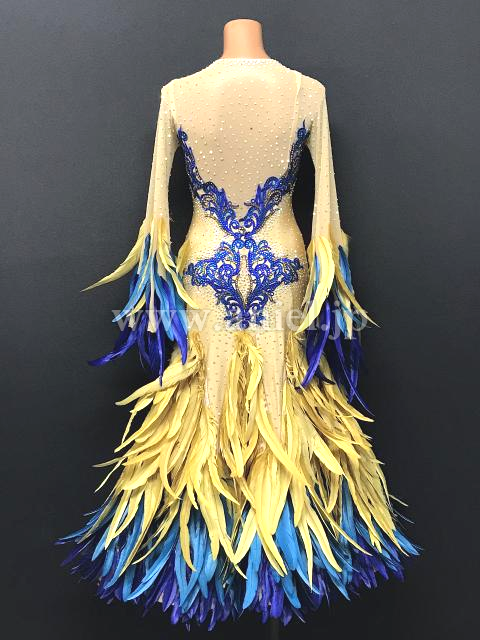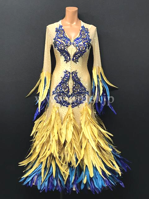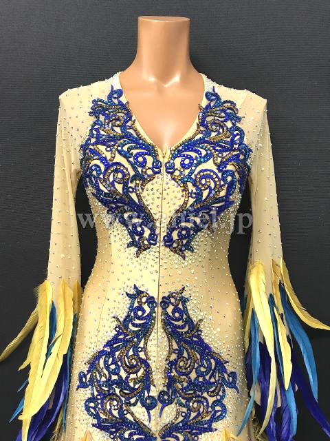 ゴールドに鮮やかなブルーが映えるドレスです。