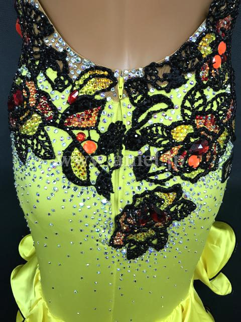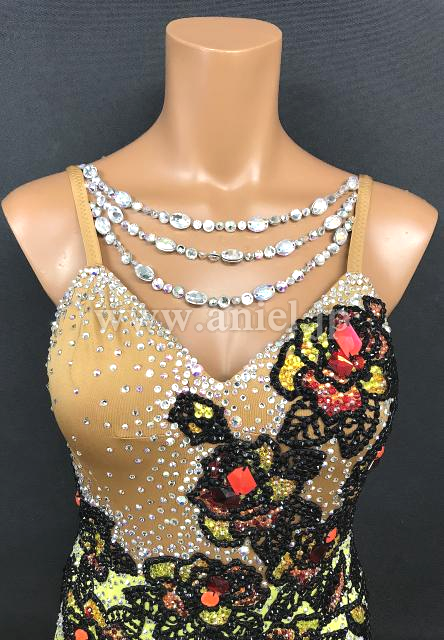 ベージュボディにモチーフレースが飾られ、カラーストーンでびっしりと装飾が施されています。
