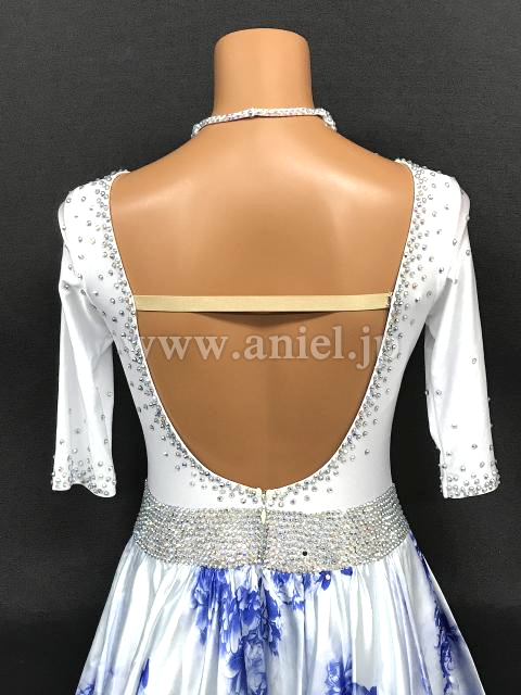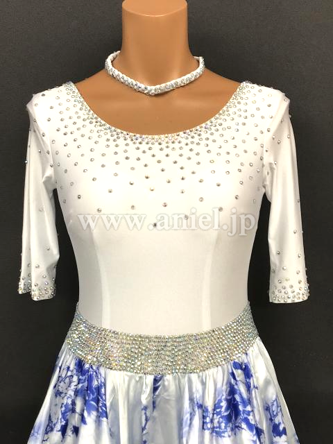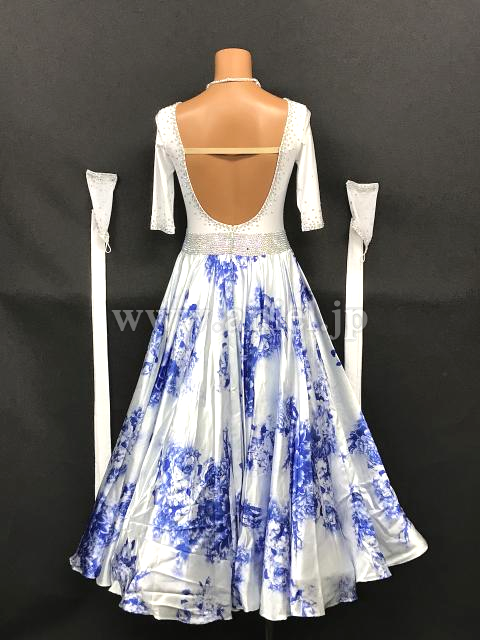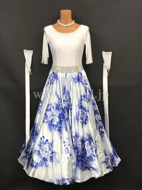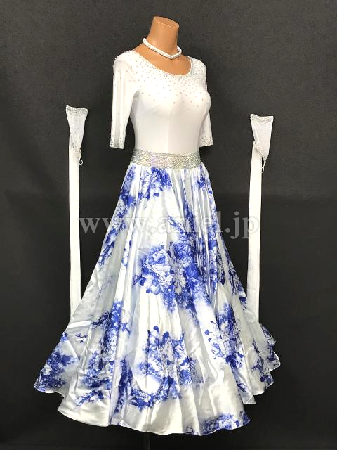 白に青の花柄スカートが美しいドレスです。