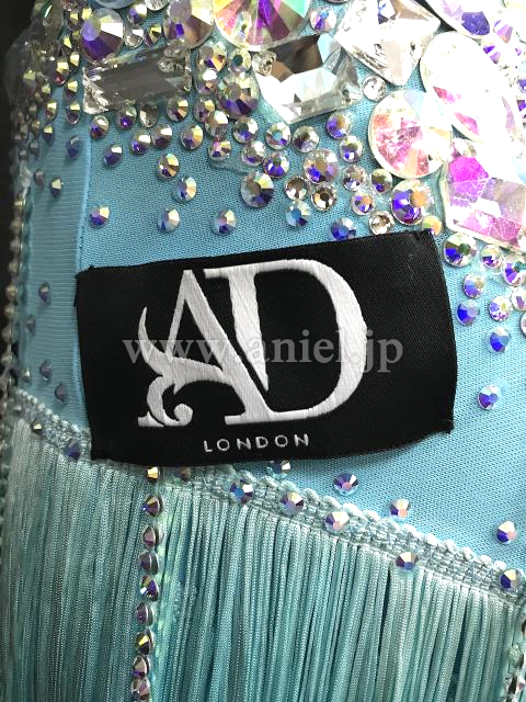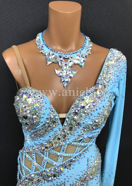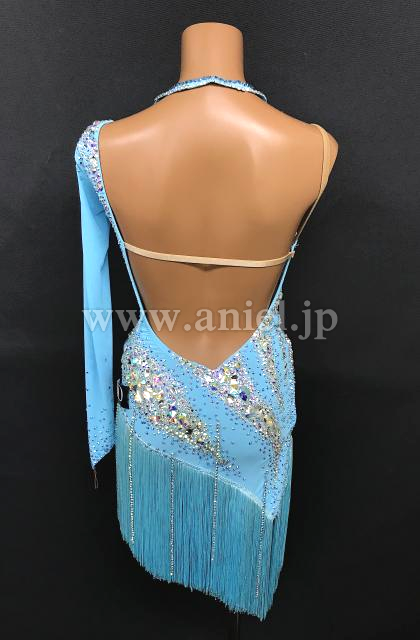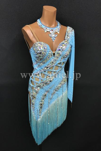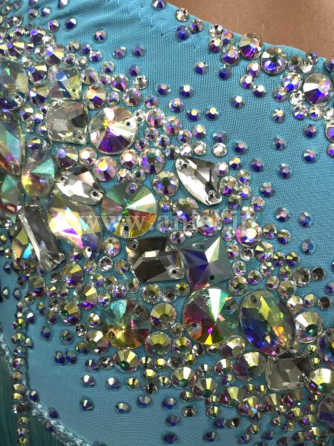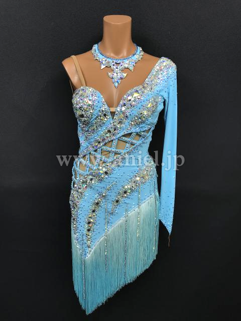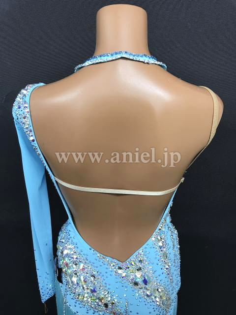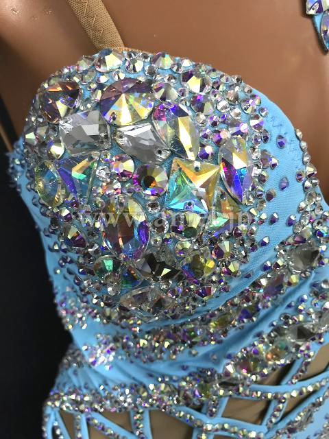 鮮やかなライトブルーカラーにオーロラのストーンを豪華にデザインした1着。