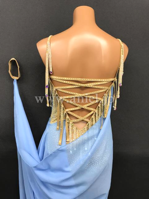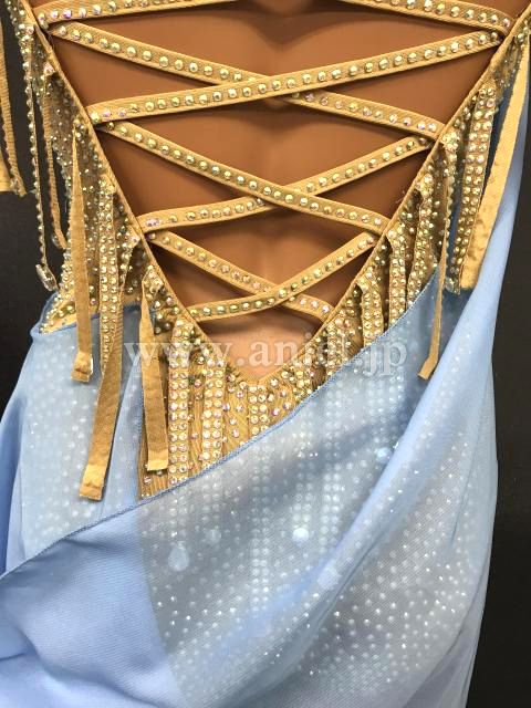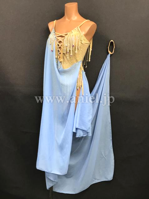 スキンカラーのレオタードには布フリンジとオーロラストーンがびっしり。