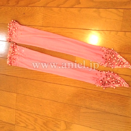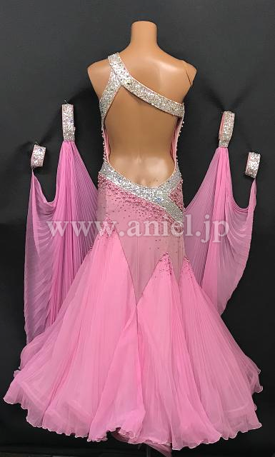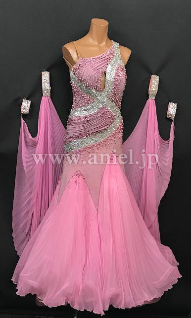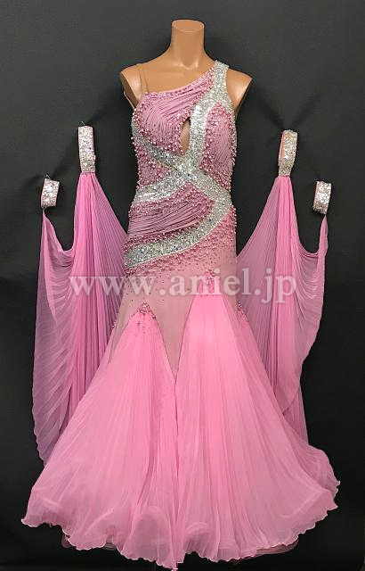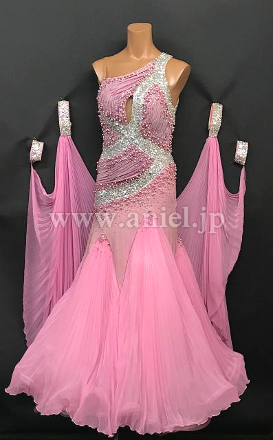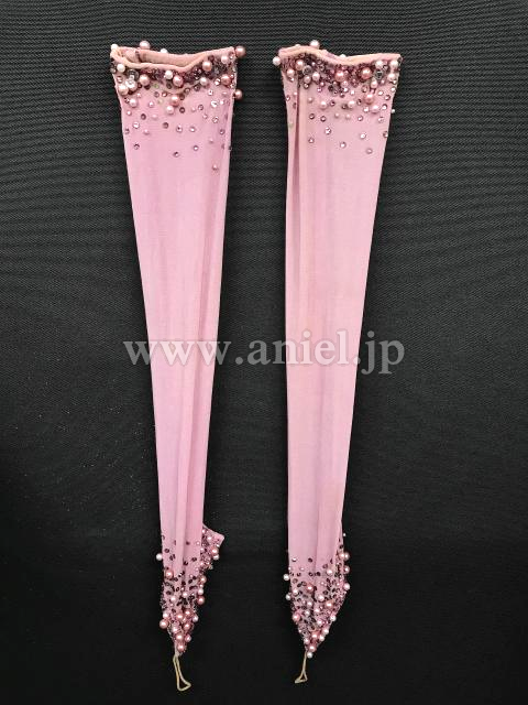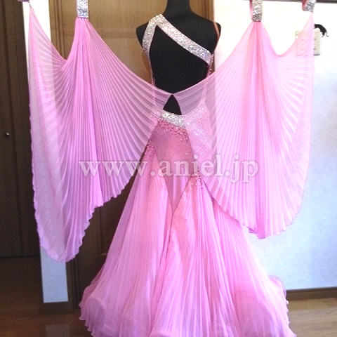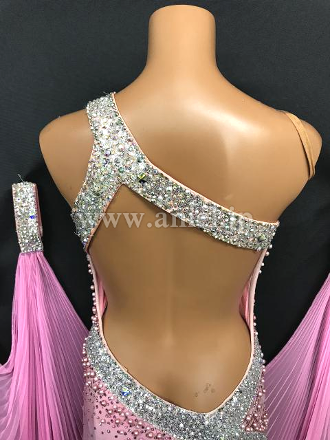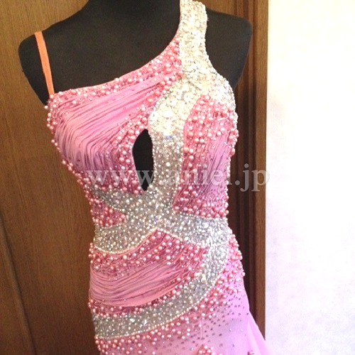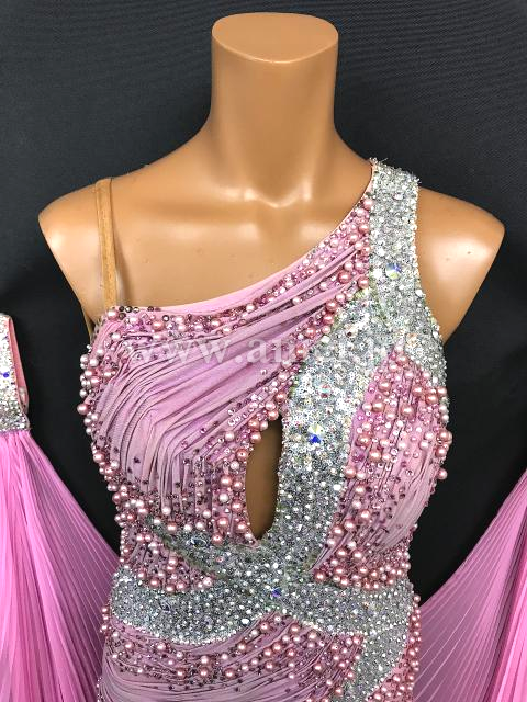 クリスアン社のクリスティ・ボイスのスポンサードレスです。ピンクパール、スワロフスキーの石がびっしりついています。一番上のスカートとフロートはプリーツ加工になっています。手袋もついています。