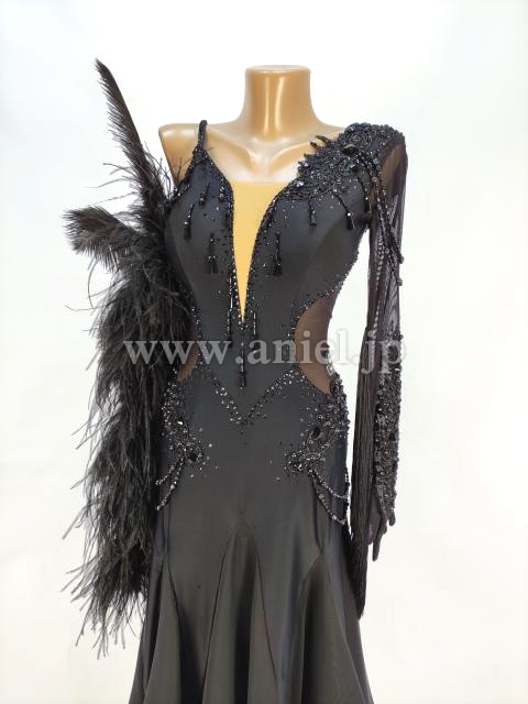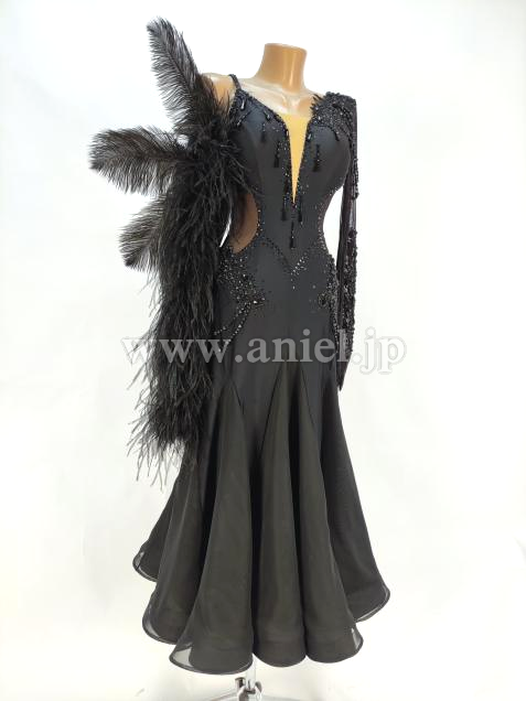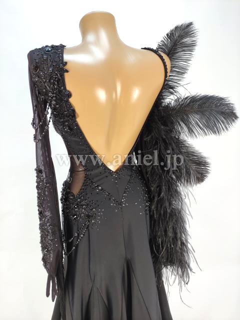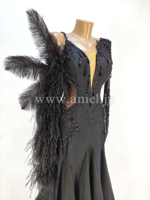 黒のすっきりした美しいラインのドレスに大きな羽根の装飾が目立つドレスです。