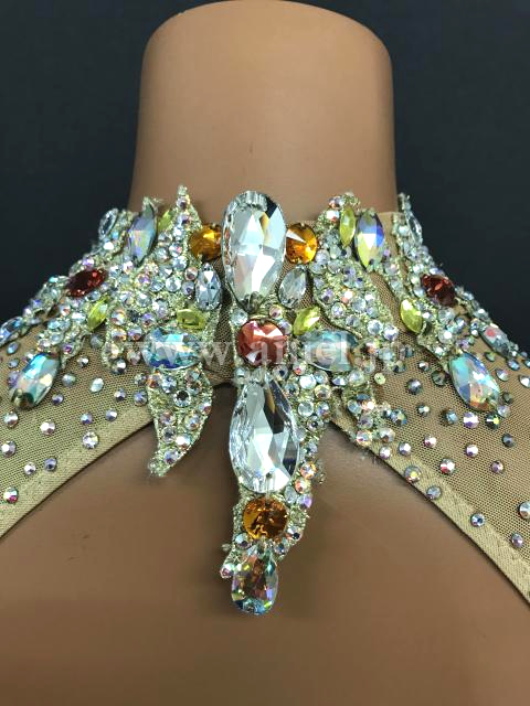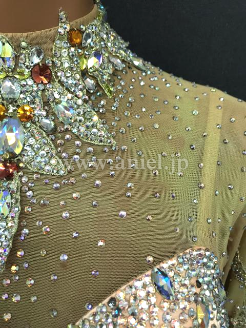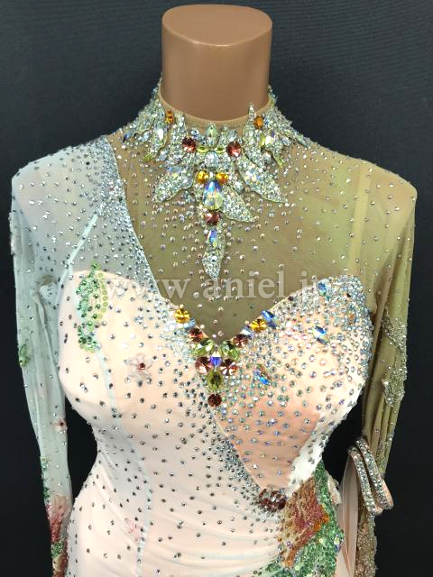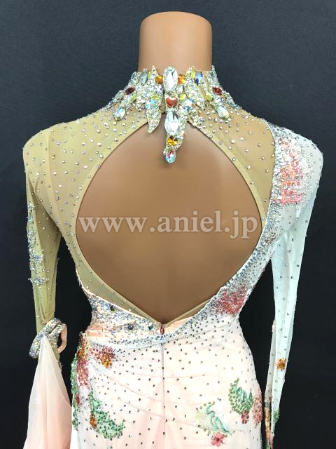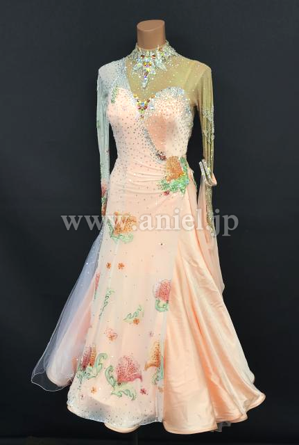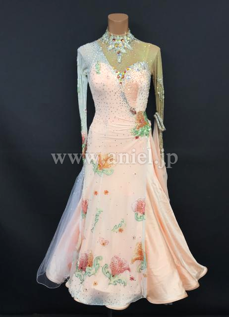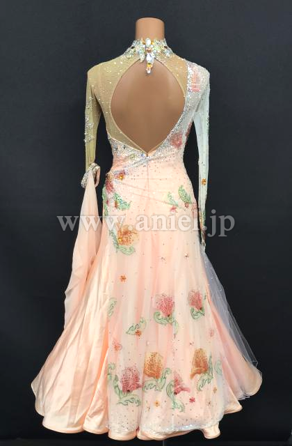 淡いオレンジカラーにカラフルな花モチーフが可愛らしいドレスです。