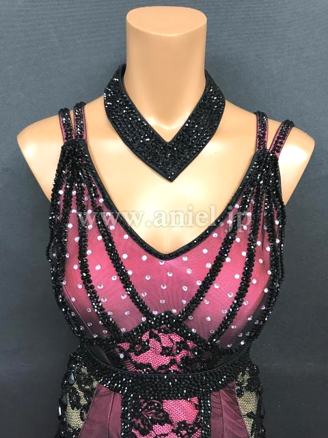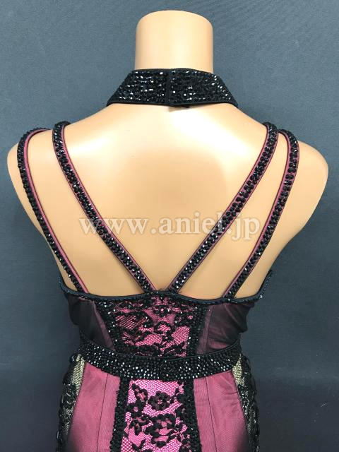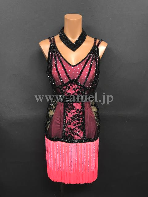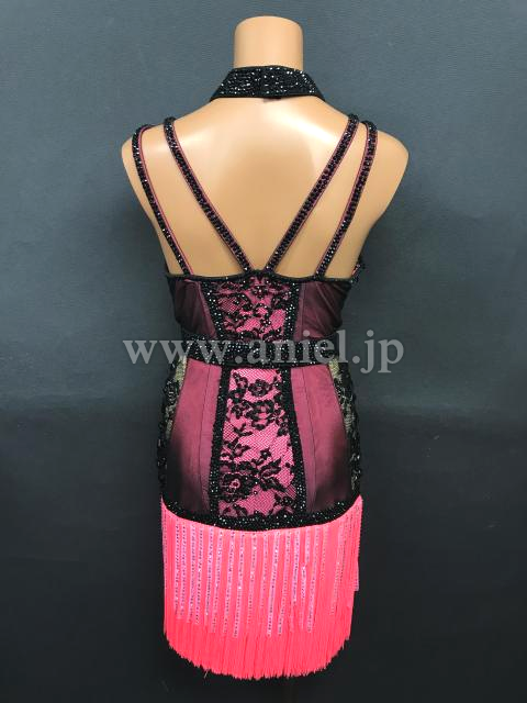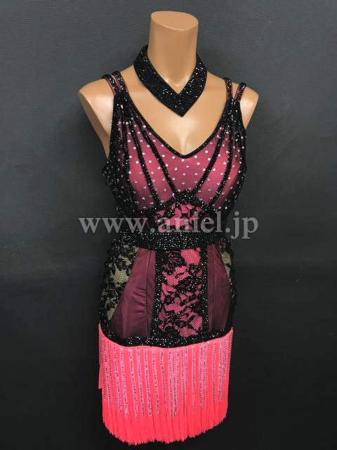 明るいピンクに黒のネットがおしゃれに重ねられたドレスです。