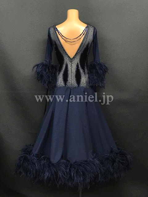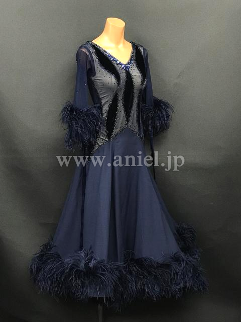 流行りの羽根が裾についたAラインスカートがよく広がるドレスです。