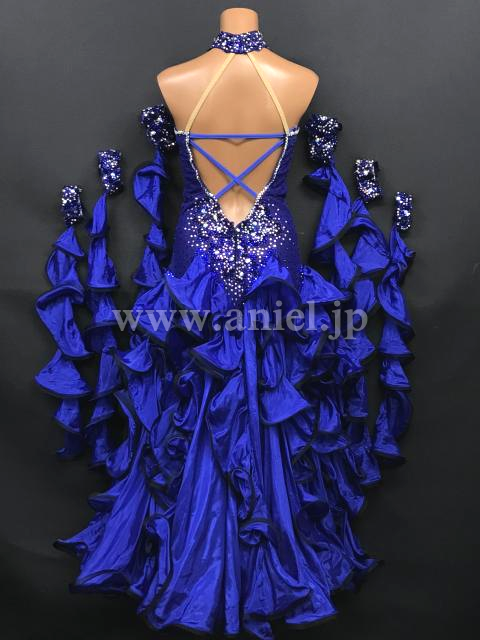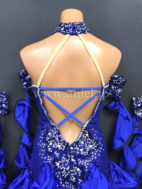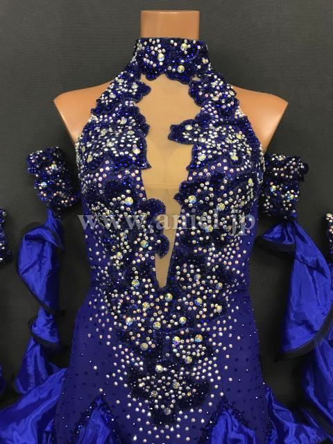 深い青に黒がシックなドレスです。