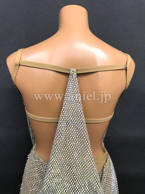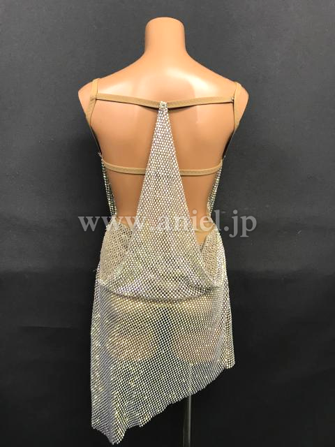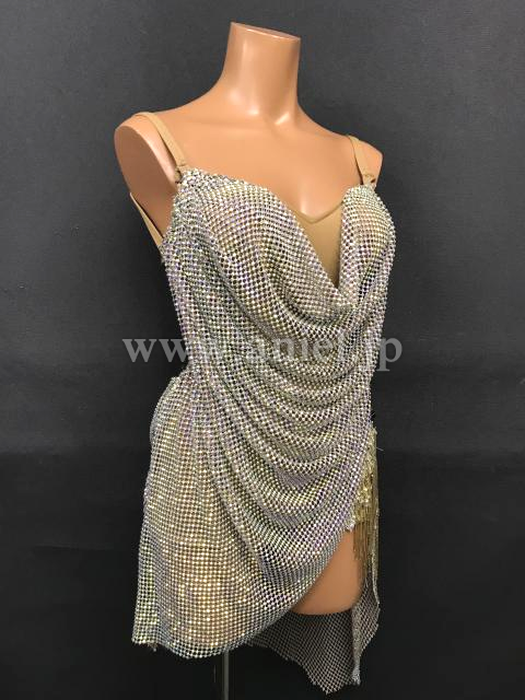 ストーンが貼られたキラキラのメッシュ生地をドレープにしたミニ丈ドレスです。