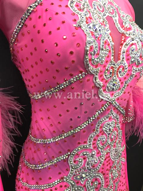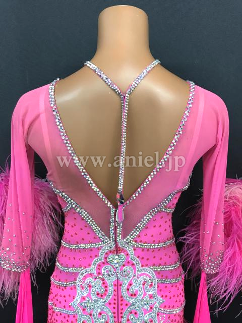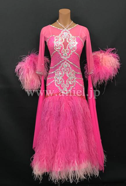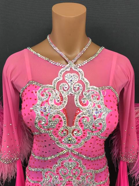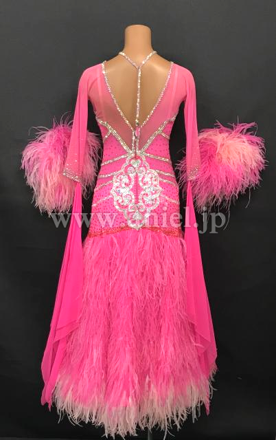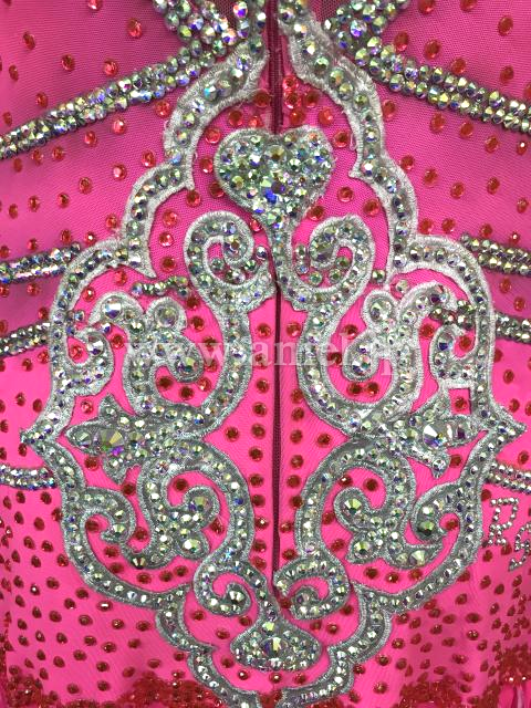 鮮やかなピンクに白モチーフレースのラインが派手なドレスです。