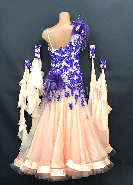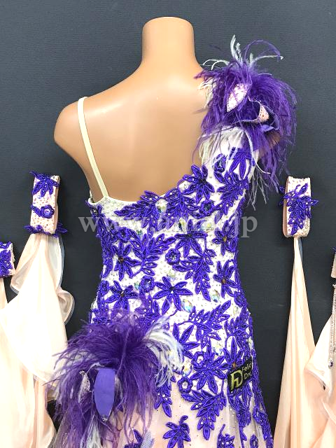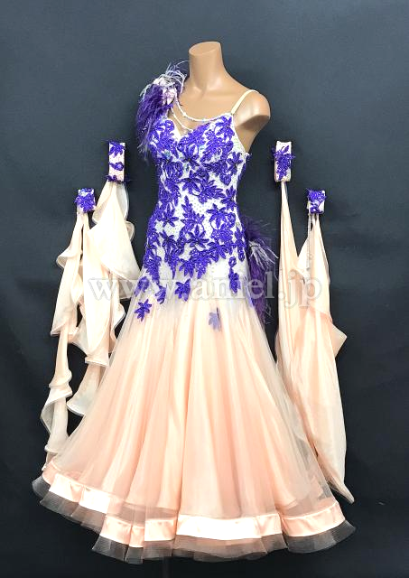淡いシャンパンカラーに紫のモチーフレースが鮮やかに映えるドレス。