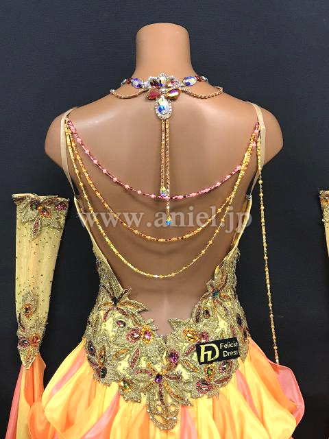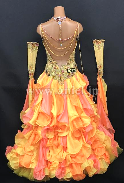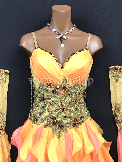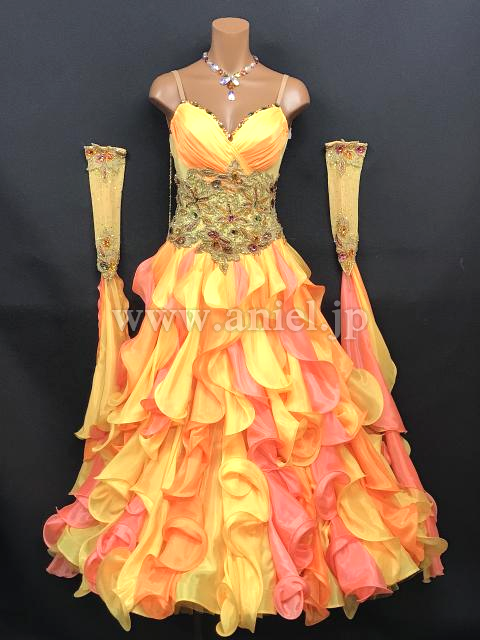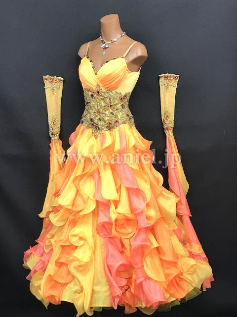 黄色とオレンジのフリルスカートがボリュームたっぷりで存在感のあるドレスです。