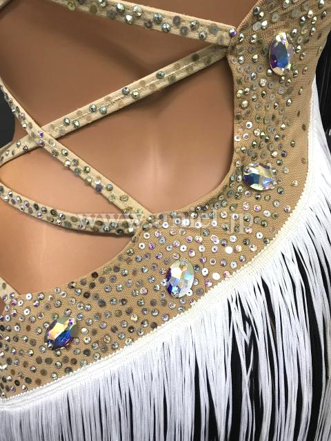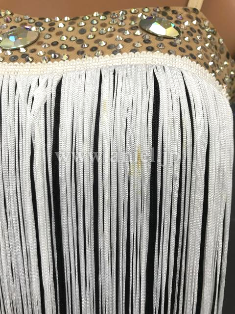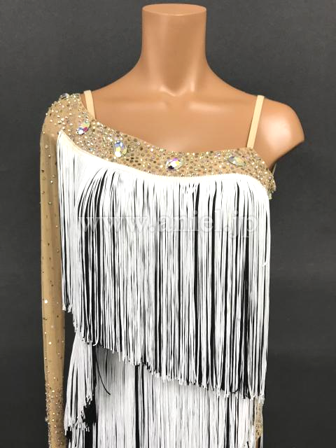 交互の斜めラインに配置された白黒のフリンジがよく踊るドレスです。