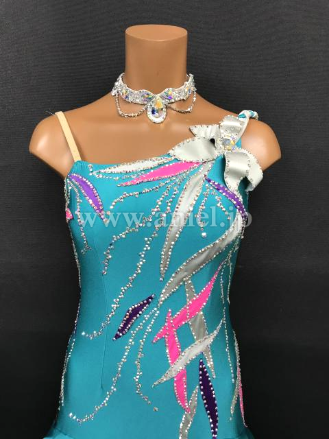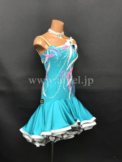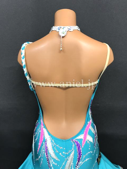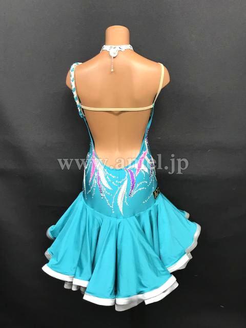 明るいジェードカラーにカラフルな模様が映えるドレスです。