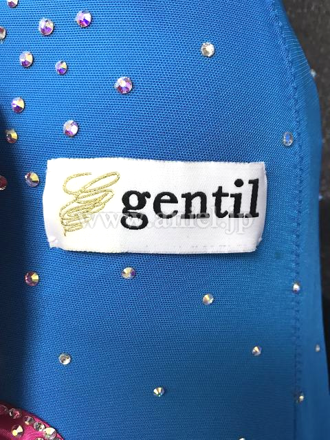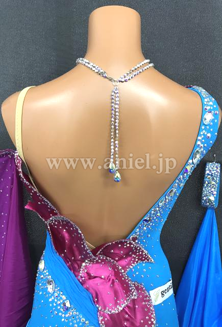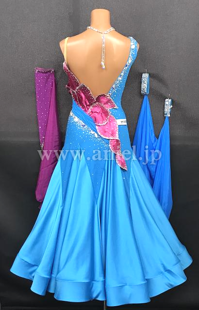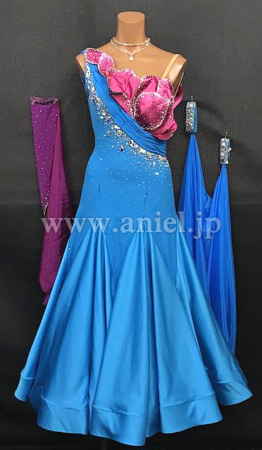 明るい水色にピンクの立体モチーフが華やかに映えるドレス。