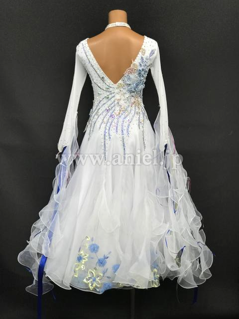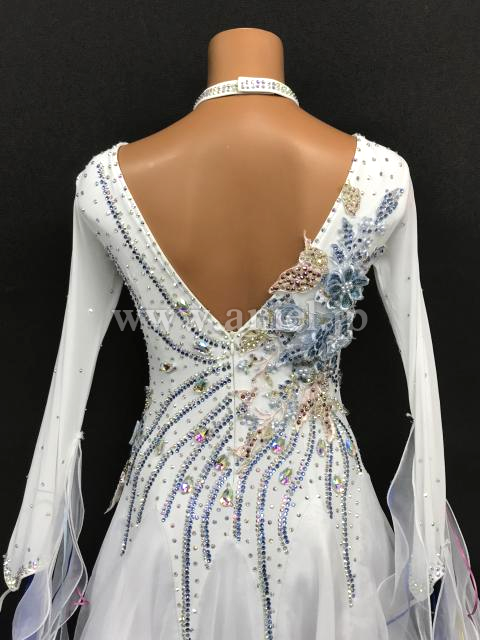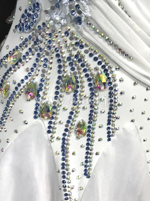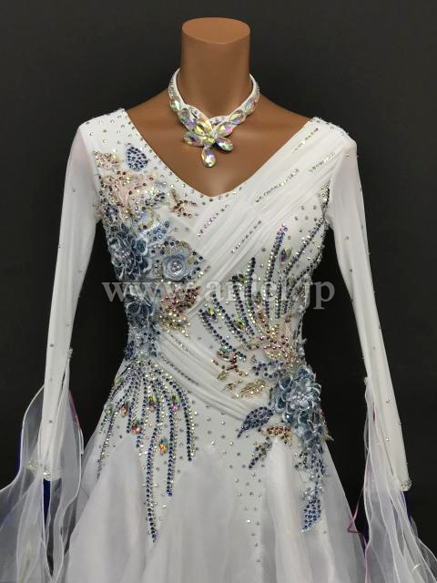 美しい白のボディに水色とピンクのモチーフレース、ストーンが装飾されています。