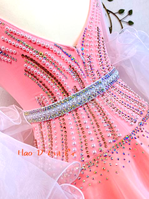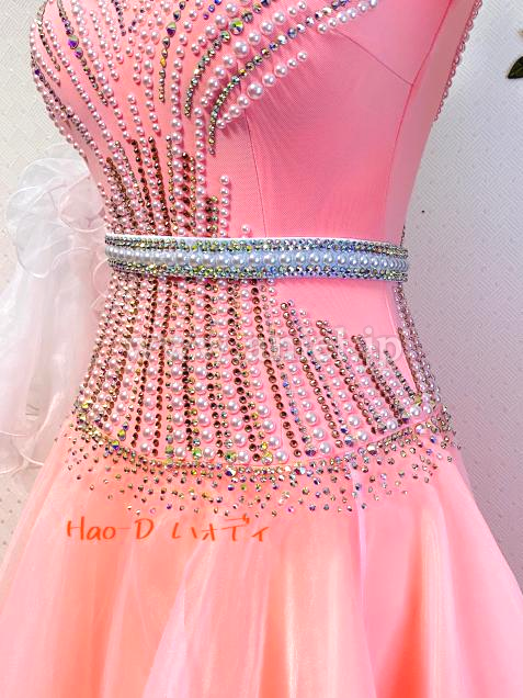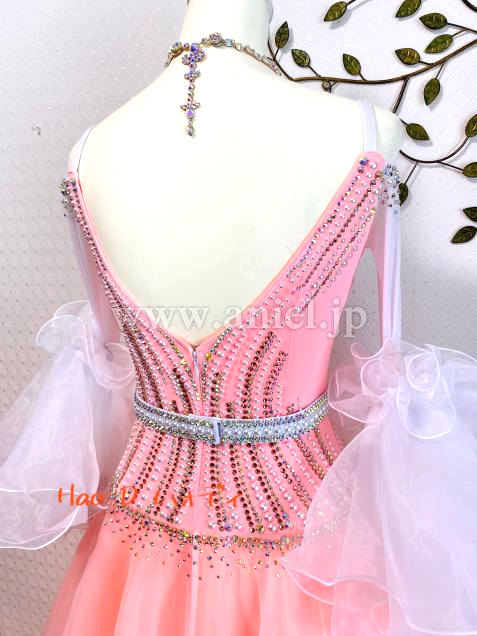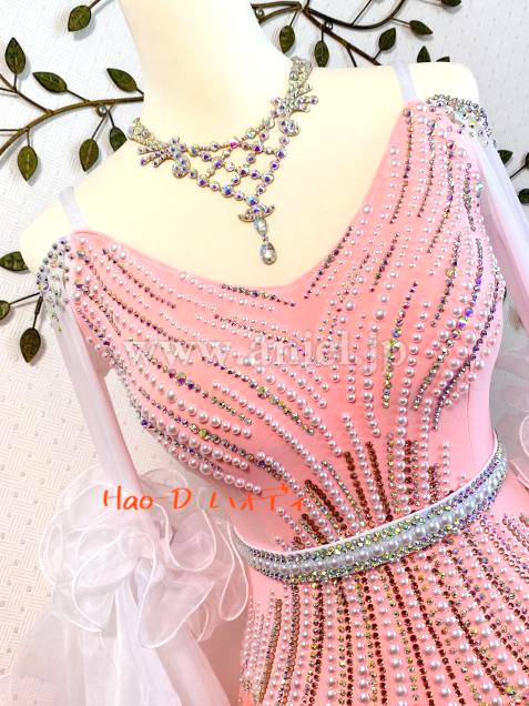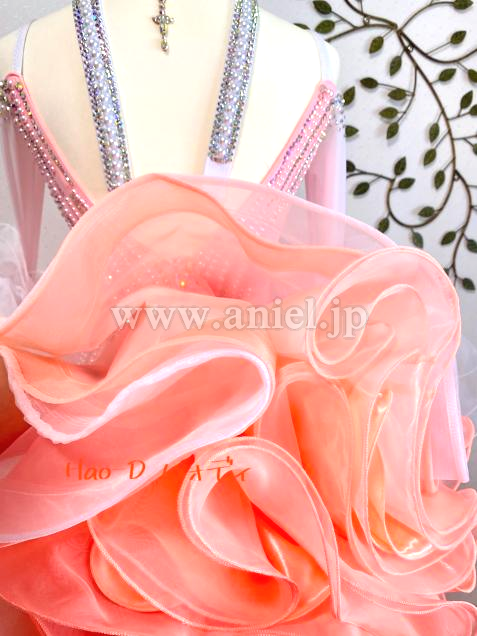 ふんわり優しいサーモンピンクにパールを装飾したスイーツのような可愛いドレス