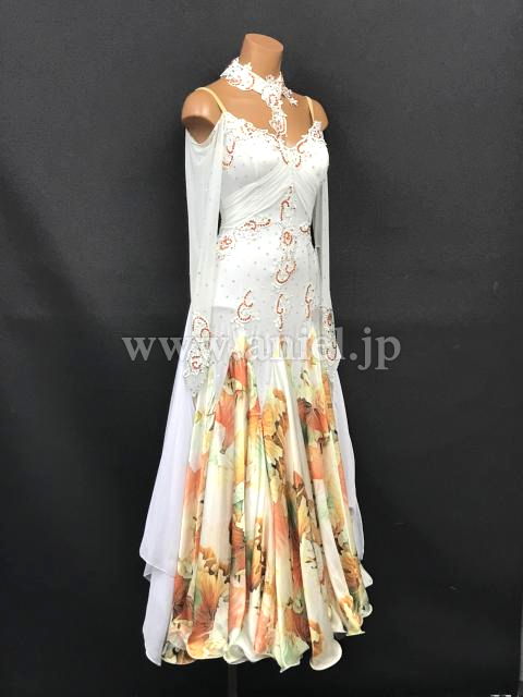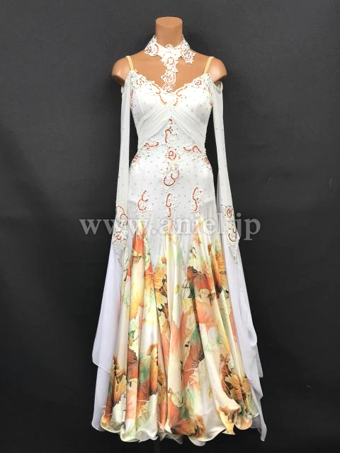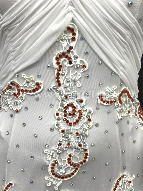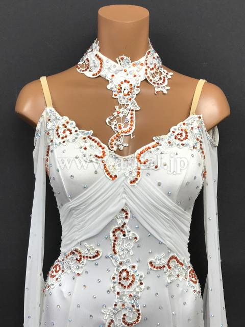 白のモチーフレースにオレンジストーンがアクセントになっているドレスです。