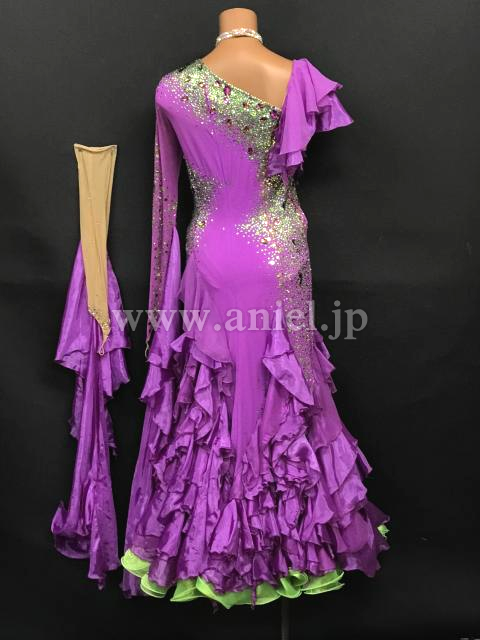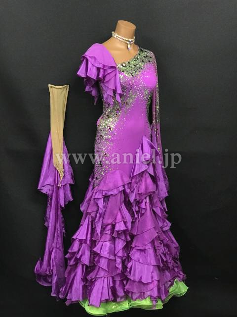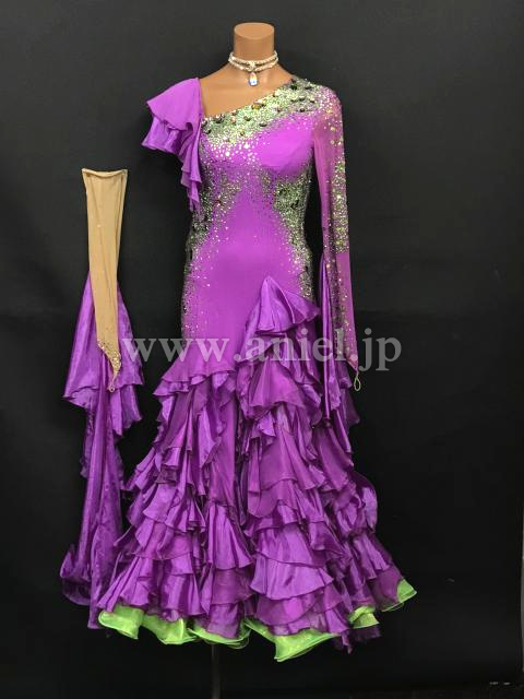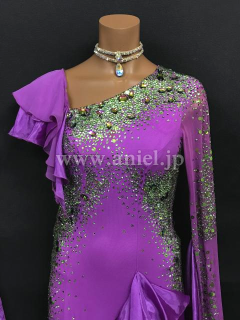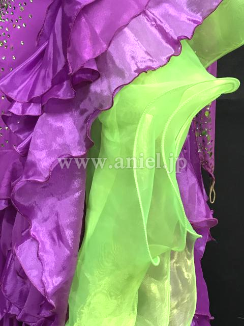 紫に緑カラーがアクセントとして使われているドレスです。
