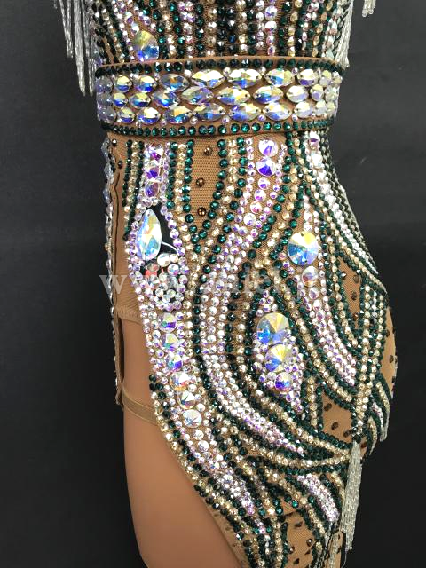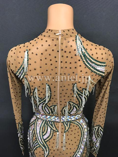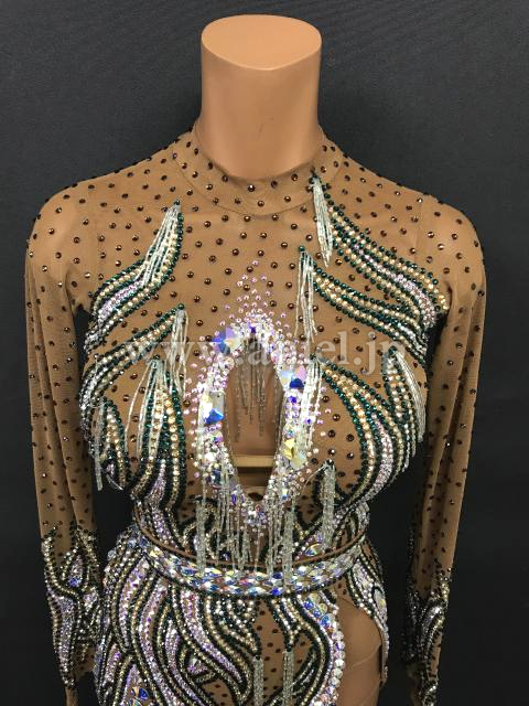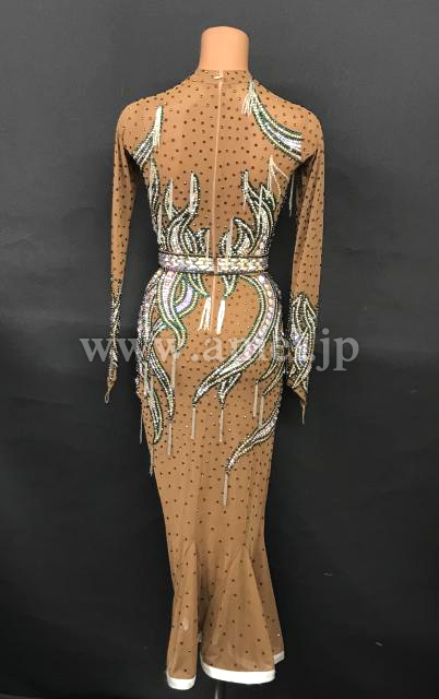 スキンカラーのロングデザインのネットにスワロフスキーストーンがびっしりの非常に豪華なドレスです。
