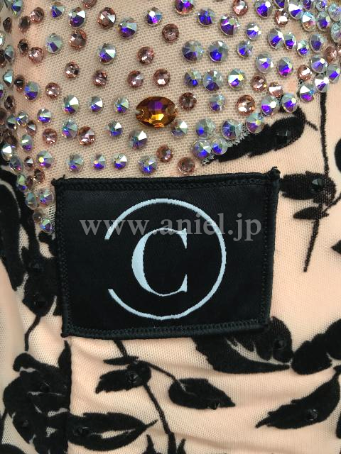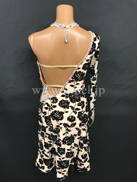 コーラル生地に黒薔薇の模様が素敵なドレス。