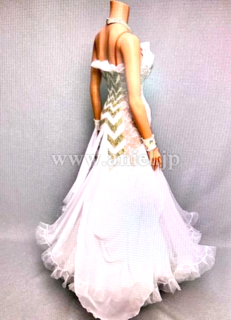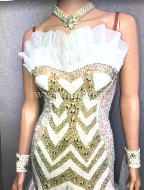 白ベロア生地にクリスタルAB、スパークルラインストーンをふんだんに使用し、又、フロートにはクリスアンジョーゼットをあしらい格調高く仕上げています。