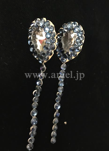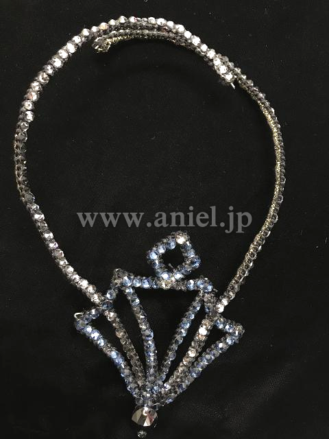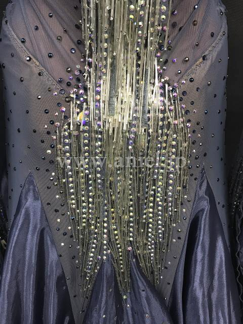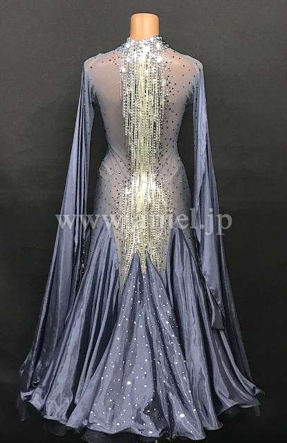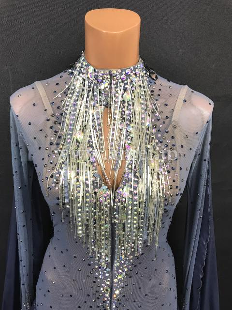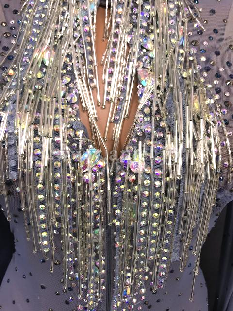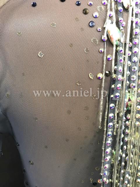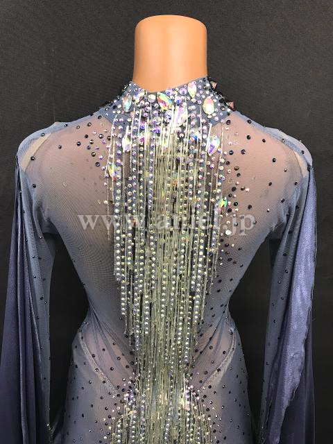 胸元や背中のセンターラインがビーズフリンジ とストーンで華やかに装飾されています。