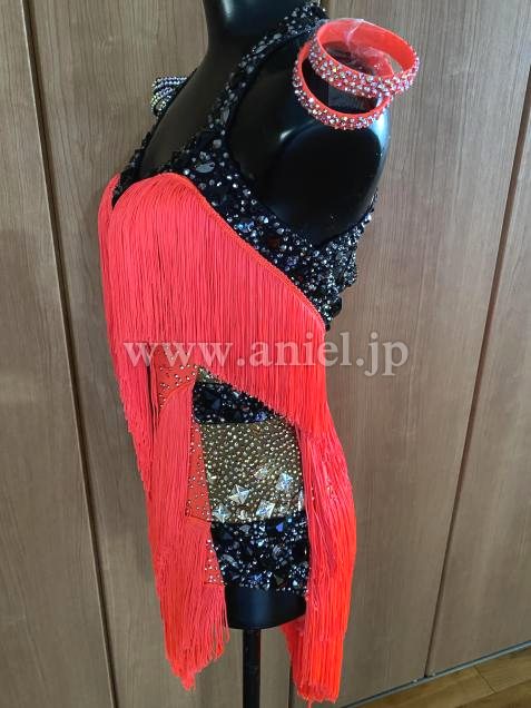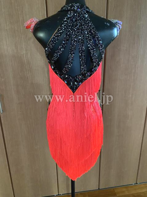 赤のフリンジに、黒のインパクトの縁取りスワロフスキーがぎっしり付き、バックの背中のバルーン風が動きにもプラスα