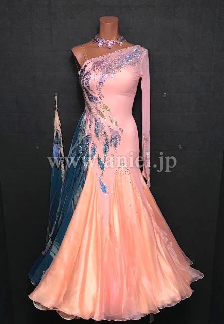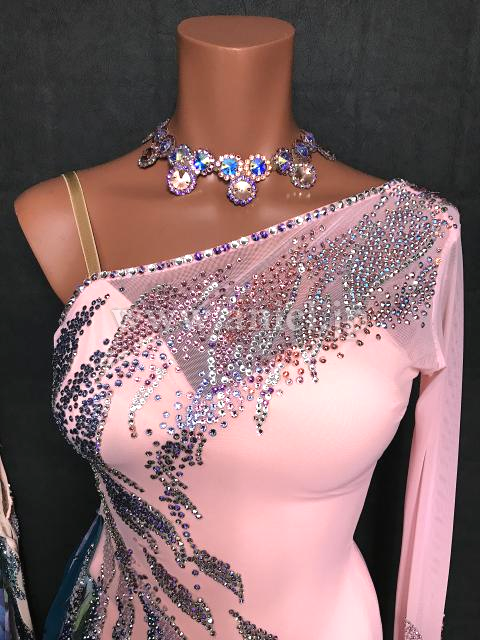 斜めオフショルダーのデザインで肩から流れるようにストーンの