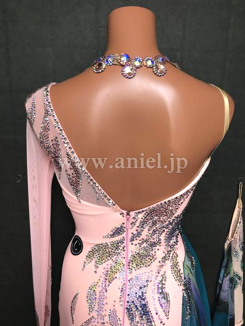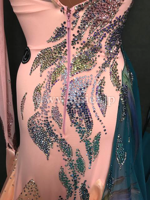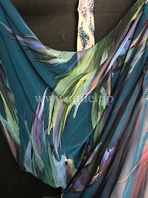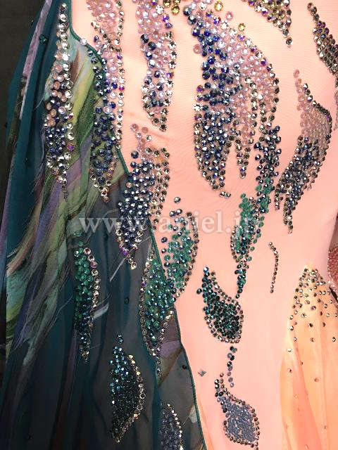 サーモンピンクとグリーンの柄生地の美しいドレス