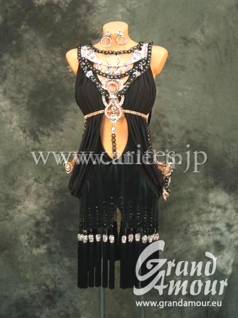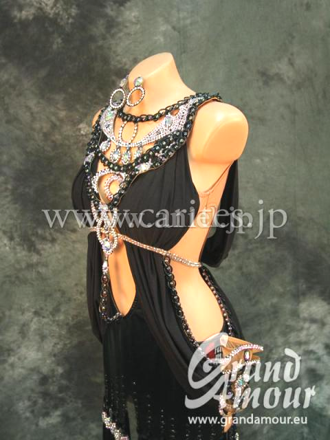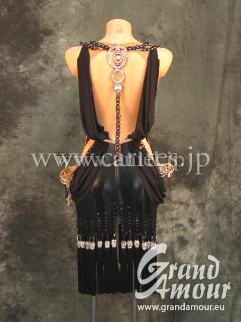 Grand AmourがスポンサーしているイスラエルのJenya Libmanのスポンサードレスです。黒ですが面白い飾りと、面白い生地の組み合わせです。ベースはフェイクレザーにクレープ生地がまとわれており、それぞれ踊った時に違った動き方をするので斬新です。胸元と背中にGrand Amourらしい凝ったハンドメイドモチーフが付いており、フロアで目を引くことは間違いないです。ベルトは胸の下から付いていて、ハイウエストのポイントとなっています。スカートの裾にはフリンジが付いていて、動くと上品に広がります。背中とお腹も空いていて、すごくセクシーなドレスです。