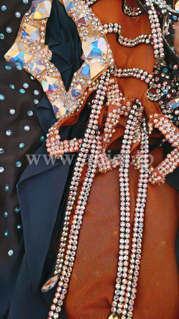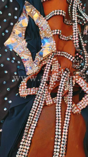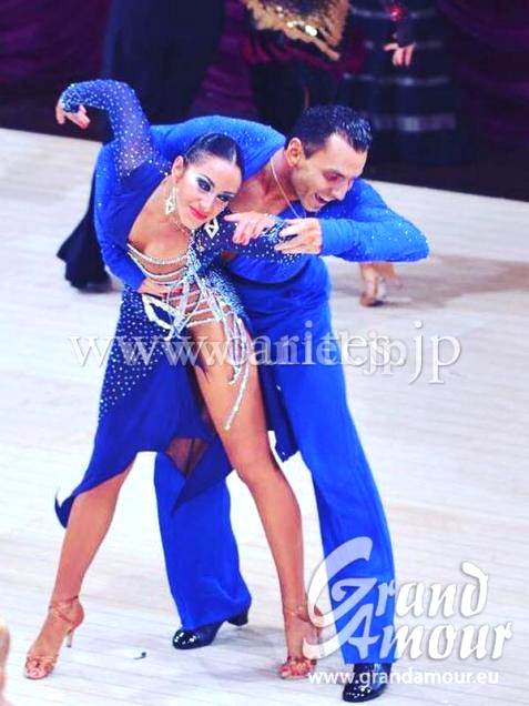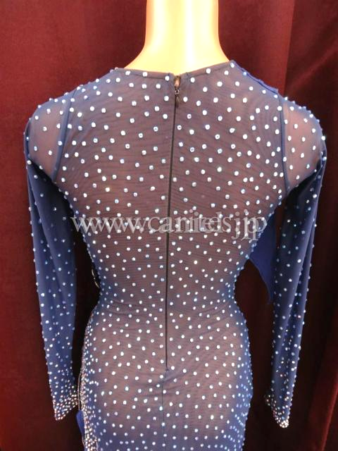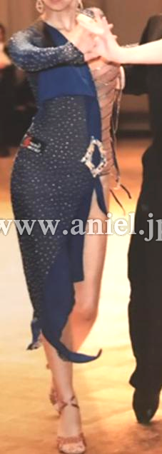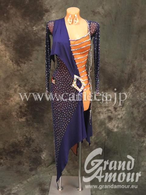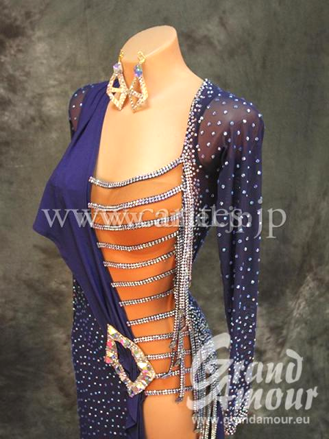 Grand Amourの中古ドレスです。着用写真はかなり明るめのブルーですが、実際はネイビーに近い青です。(紺色よりは少し明るめ)個性的でセクシーなデザインです。スカートやフロント部分の布が動くと踊りをサポートしてくれるので、ドレスに動きを求める方にもオススメです。ボリュームなどはないので、シャープな印象です。