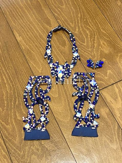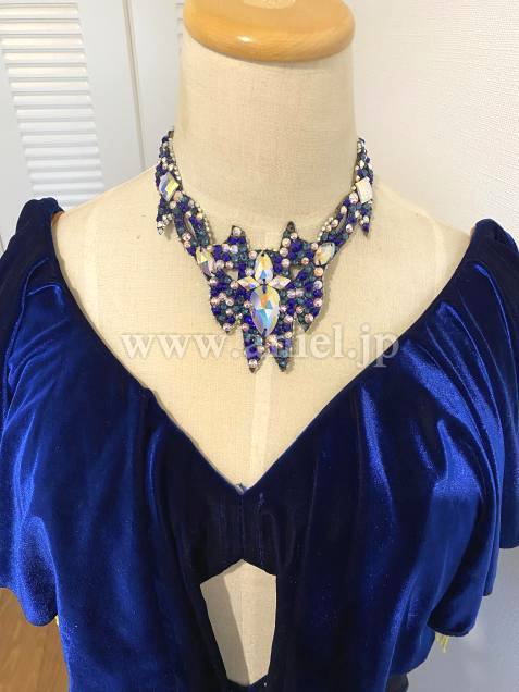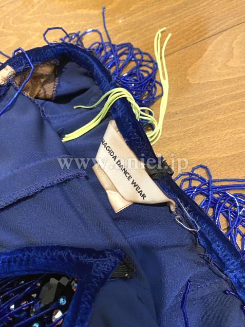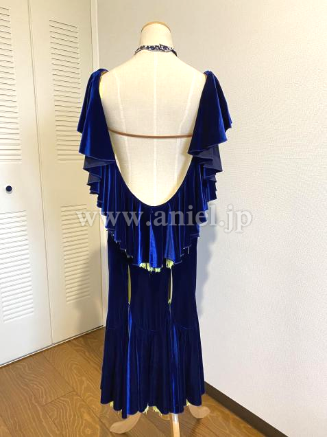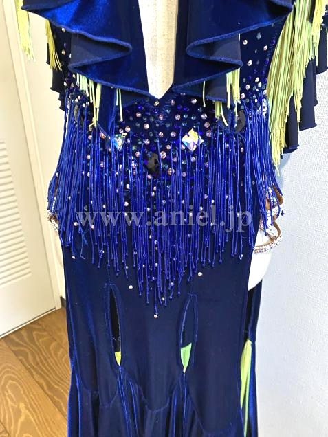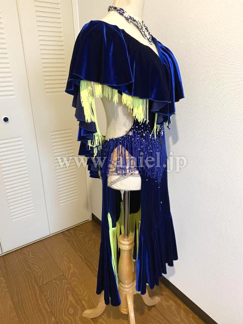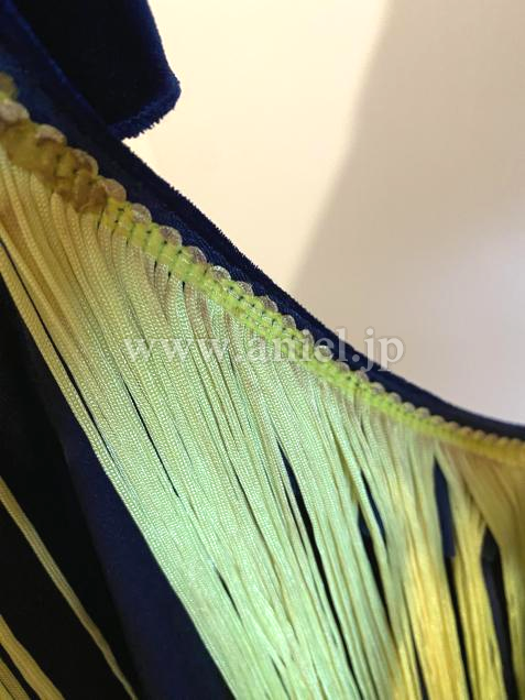 ベルベットのブルーに蛍光イエローのフリンジがよく映えるドレスです。