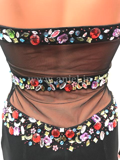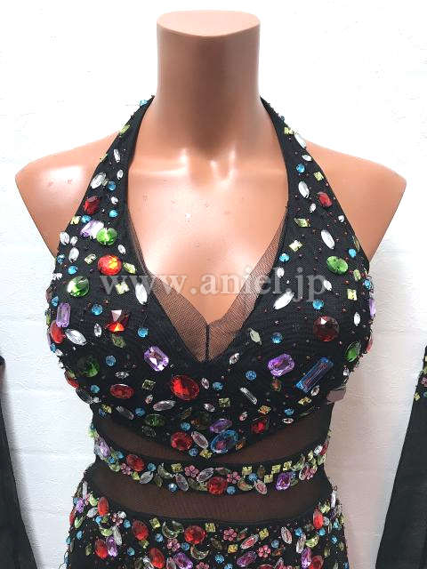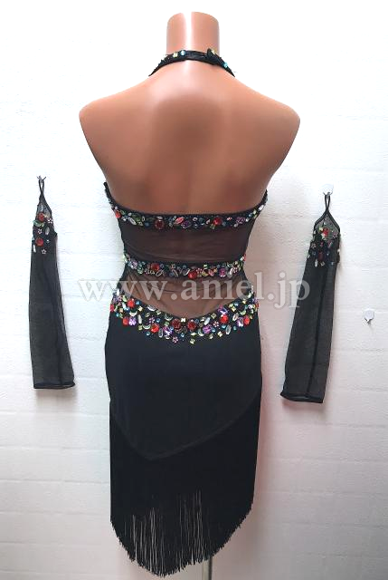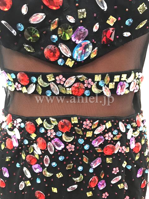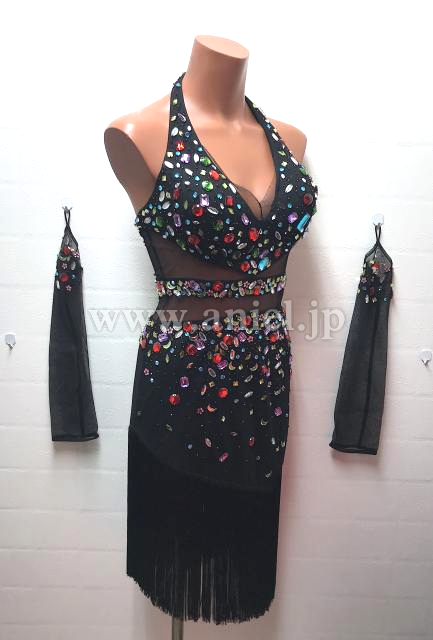 黒にカラフルなストーンが散りばめられたフリンジドレス