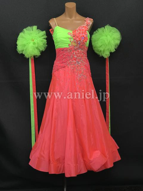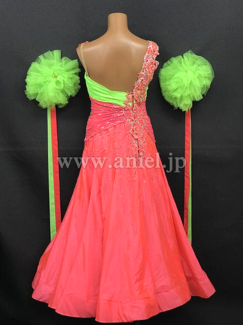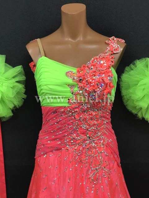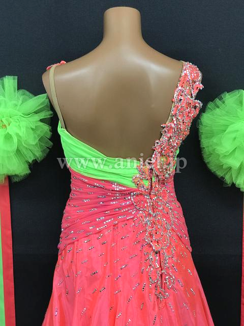 鮮やかなピンクに黄緑のコントラストが目立つドレスです。
