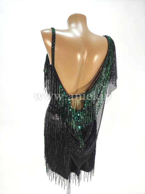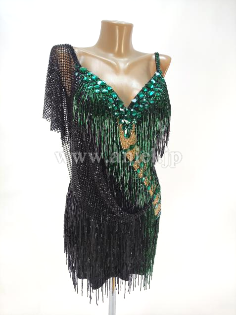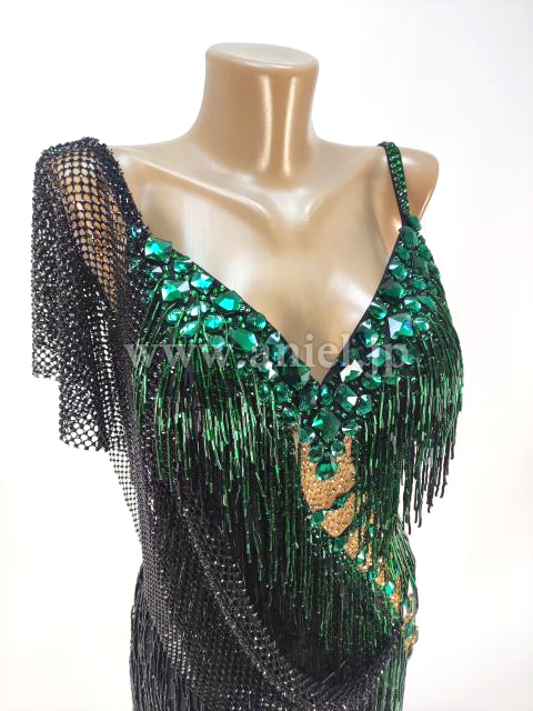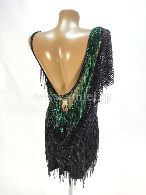 エメラルドカラーのビーズフリンジとストーンがアクセントになって大人っぽい雰囲気に。