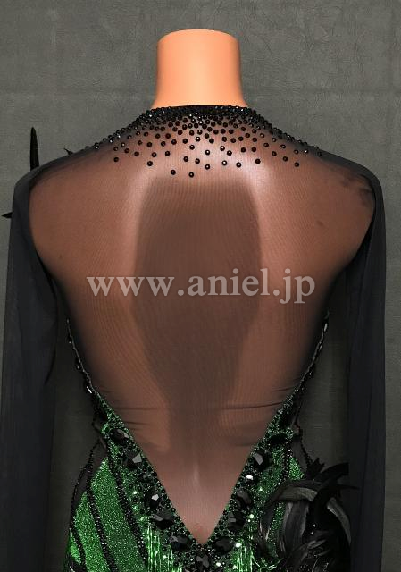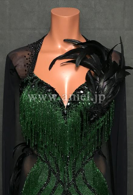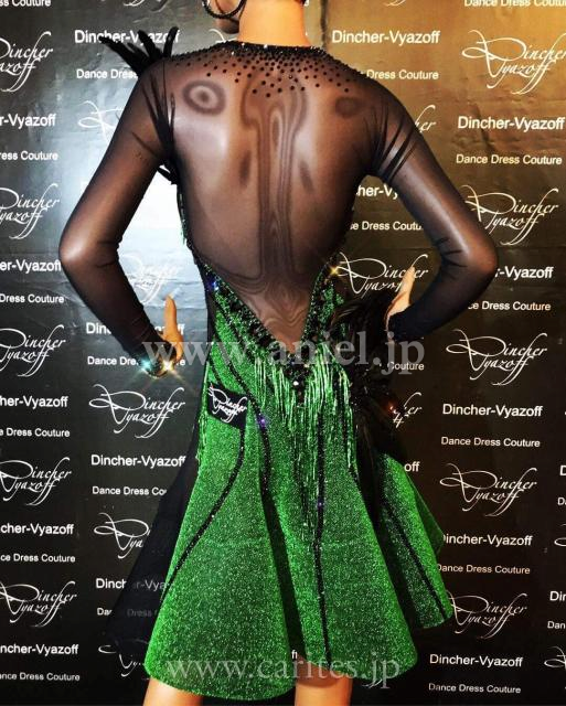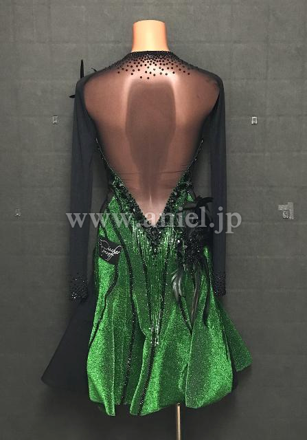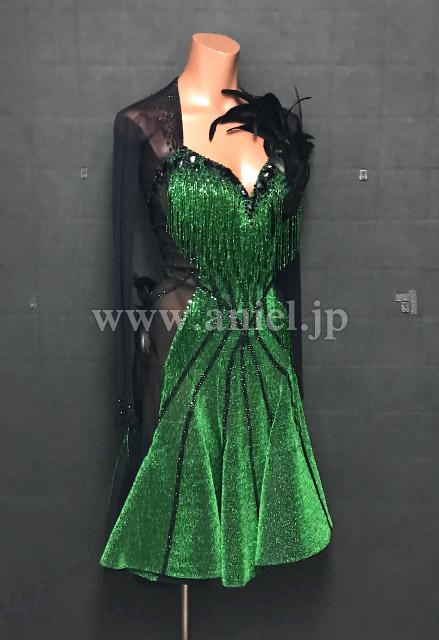 メタリックグリーン生地がとても華やかなドレス。