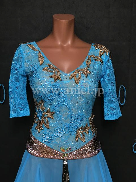 五部袖デザインの水色レース生地にベージュゴールドと
