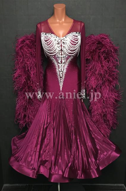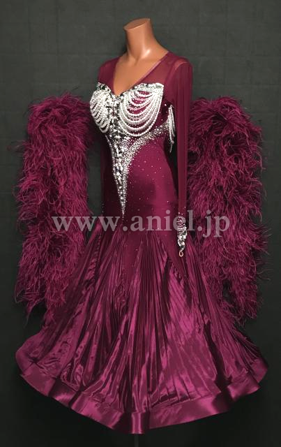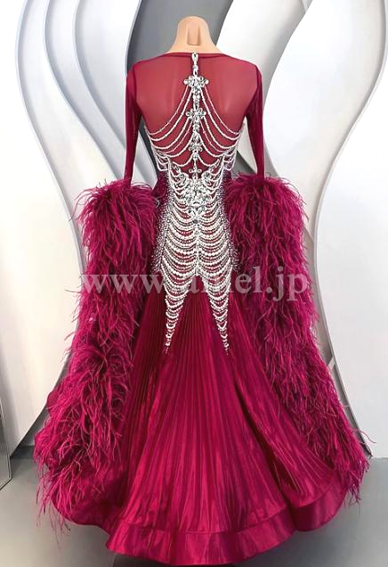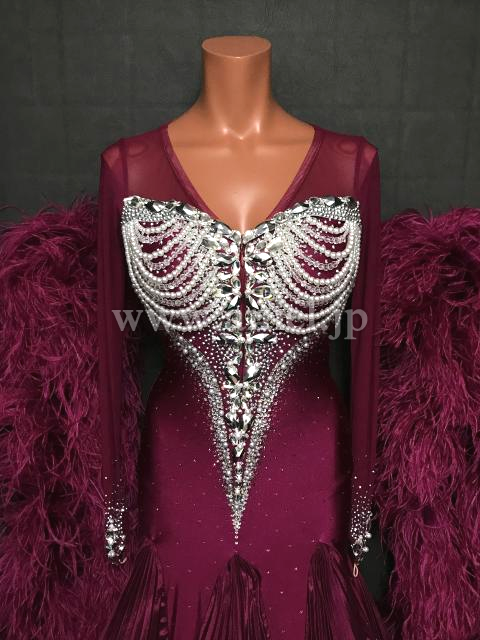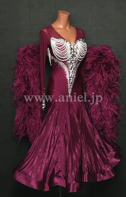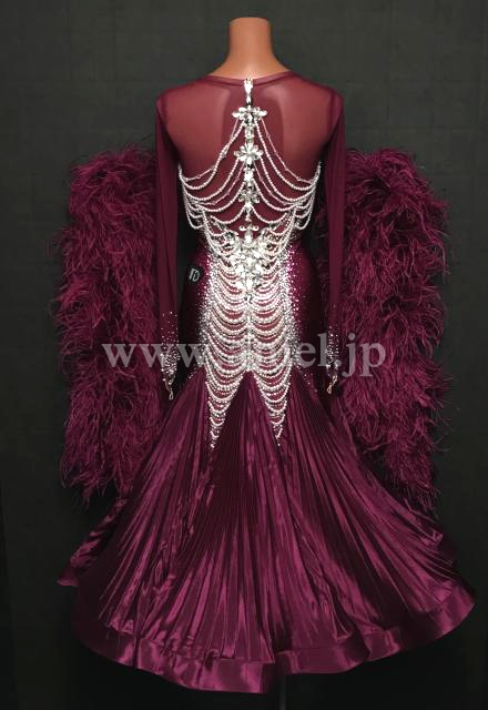 上品なドレス。ワインカラーとパールの装飾が美しく、とくにバックのデザインが見事です。スカートのプリーツと、フェザーのフロートが豊かな雰囲気を作り出します。露出が少ないため安心で、しかも、前ファスナーで着脱がし易い。