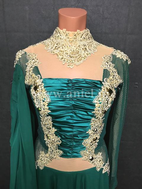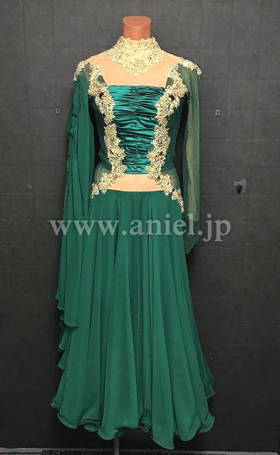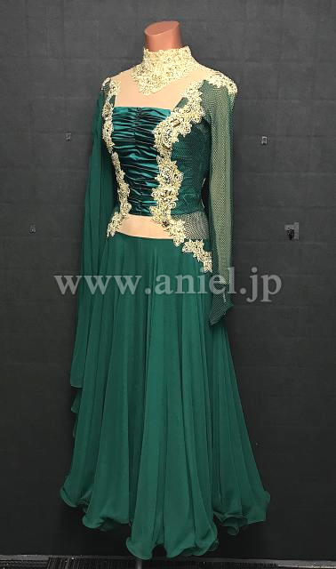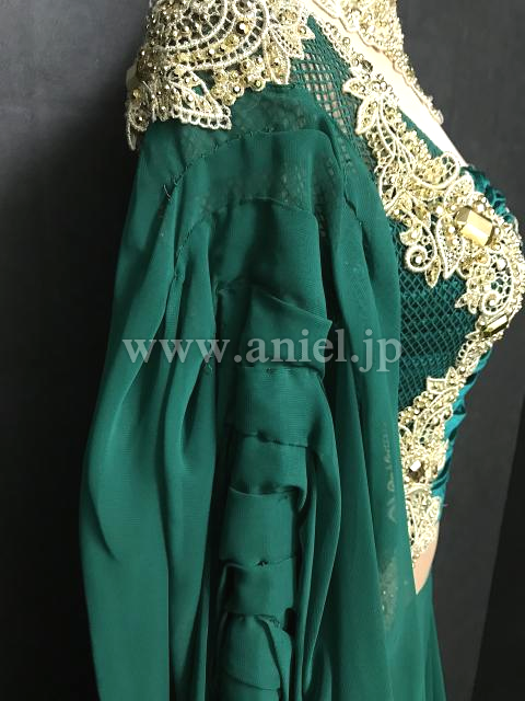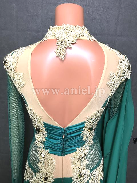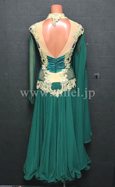 深いグリーンとゴールドの組み合わせがエレガントなドレス