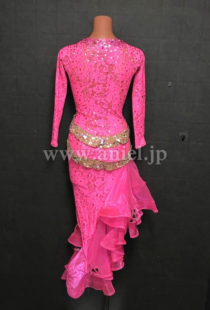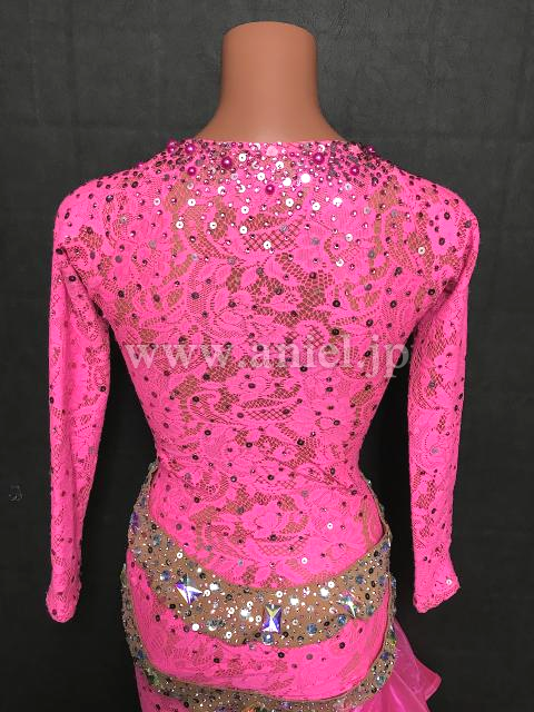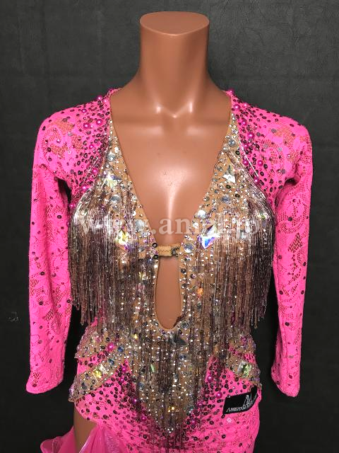 ピンクのレース生地とフリルに、ピンクシルバーの竹ビーズが沢山付いた、大人カワイイ、ドレスです。