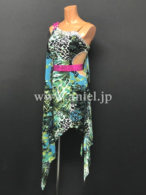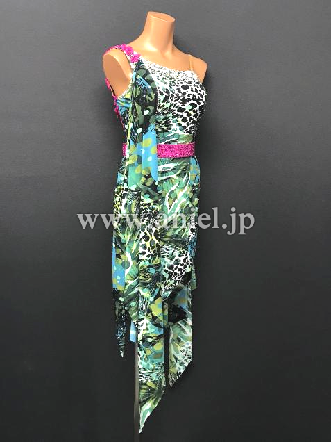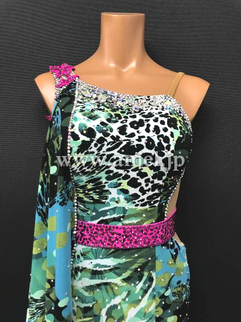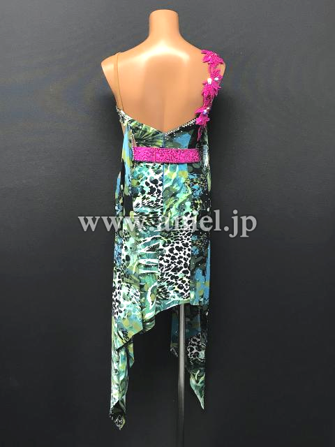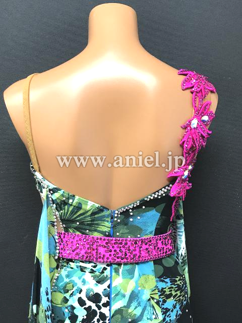 鮮やかな緑の柄生地が目を惹くドレスです。