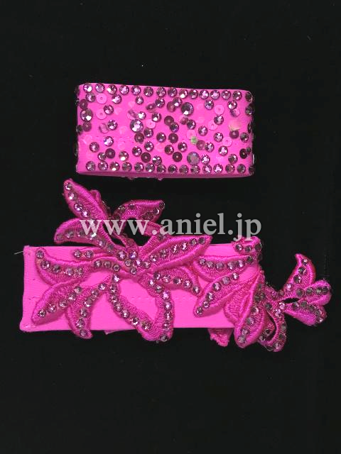 ショッキングピンクのベルト、モチーフレースが華やか。