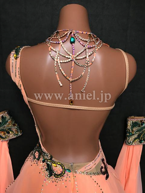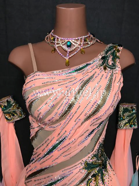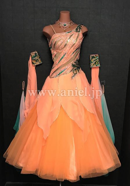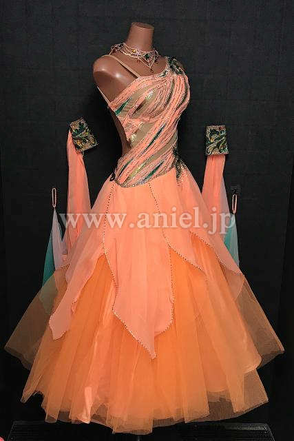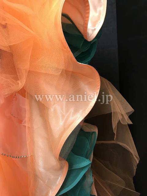 オレンジに緑がよく映えるワンショルダーデザインのドレス