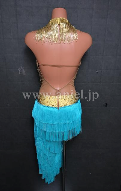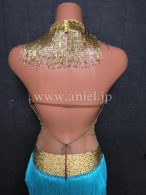 水色とゴールドのホルターネックデザインドレス
