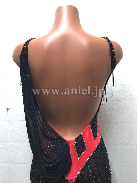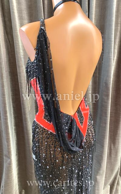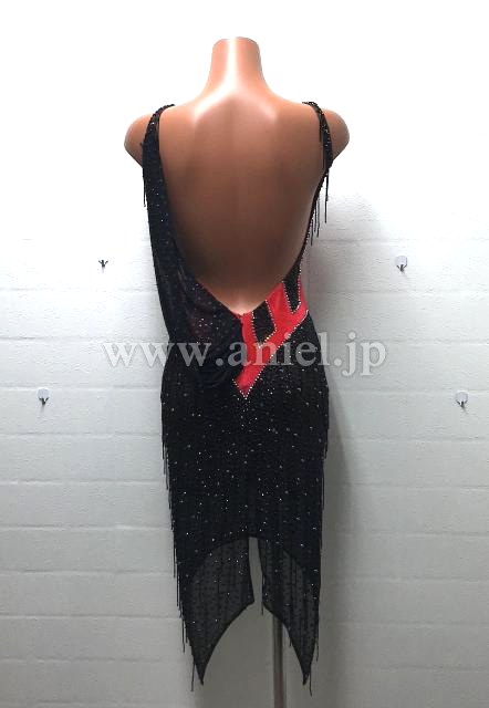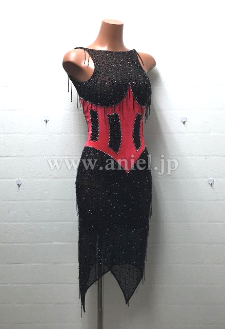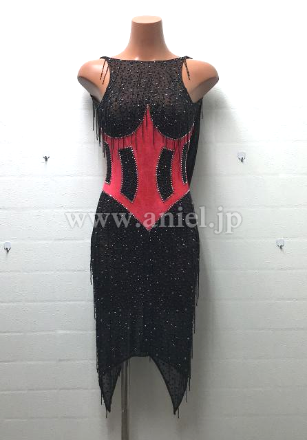 黒に大きな赤のコルセットが大胆なデザインです。黒ですがインパクトのある一着です。ドレスには全体的にストーンとビーズフリンジがついていて、タイトですがよく光ります。