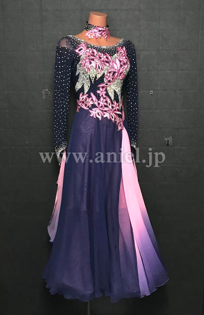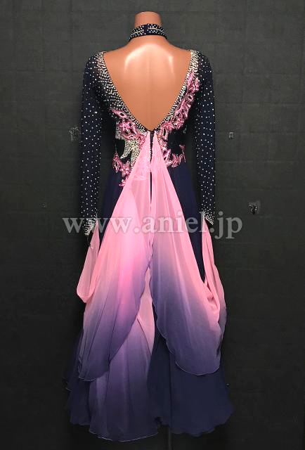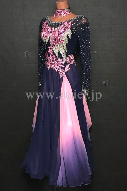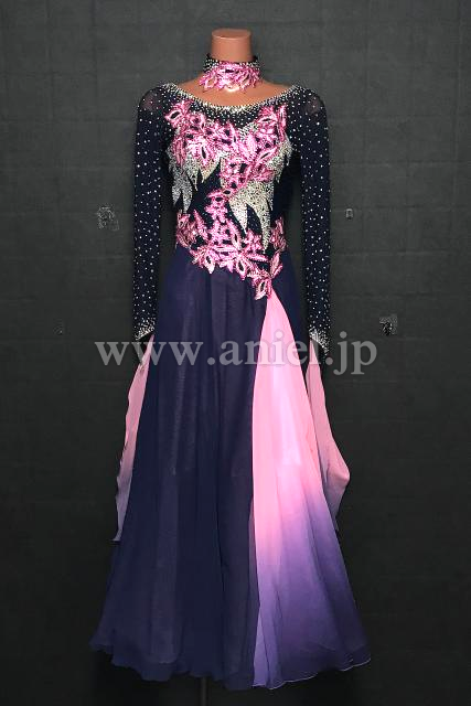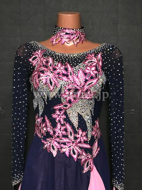 深い紺色のボディに明るいピンクのモチーフレースが可愛らしいドレスです。