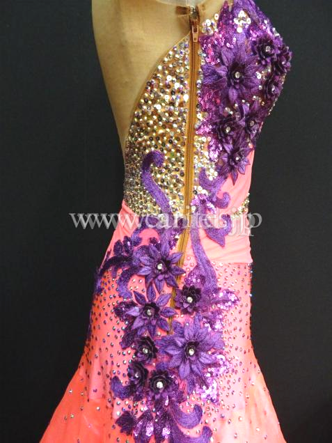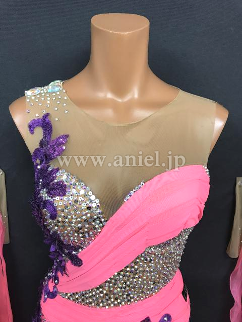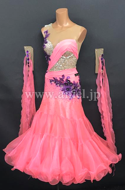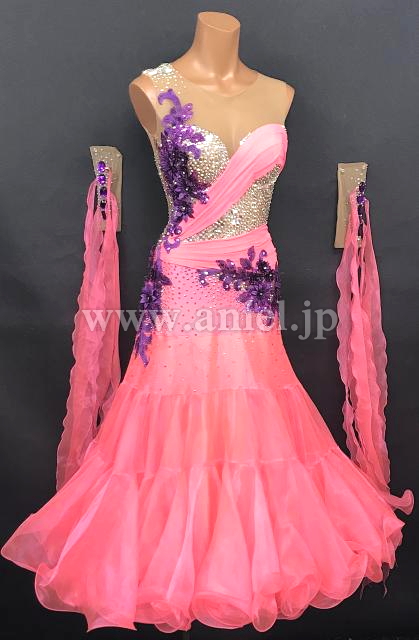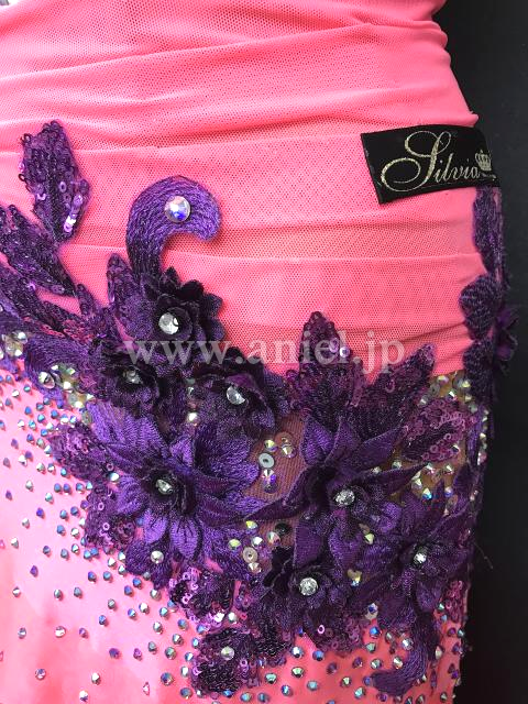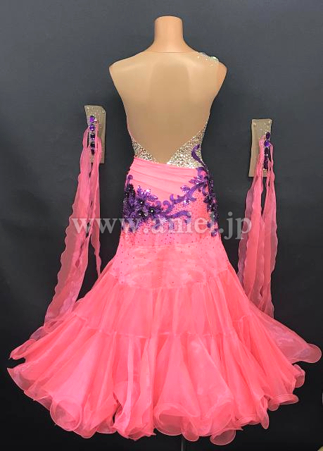 発色の良いピンクカラーにパープルのモチーフが華やかなドレス。