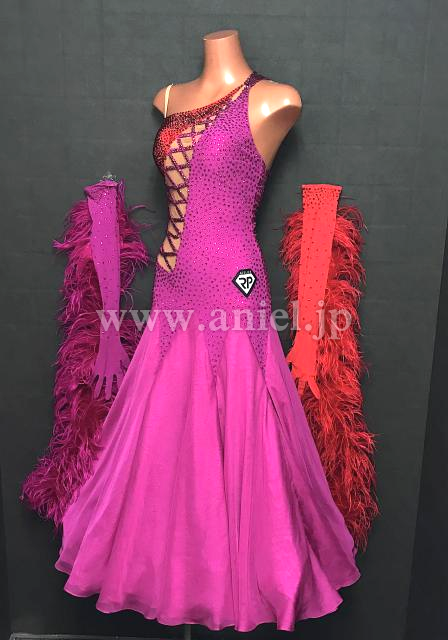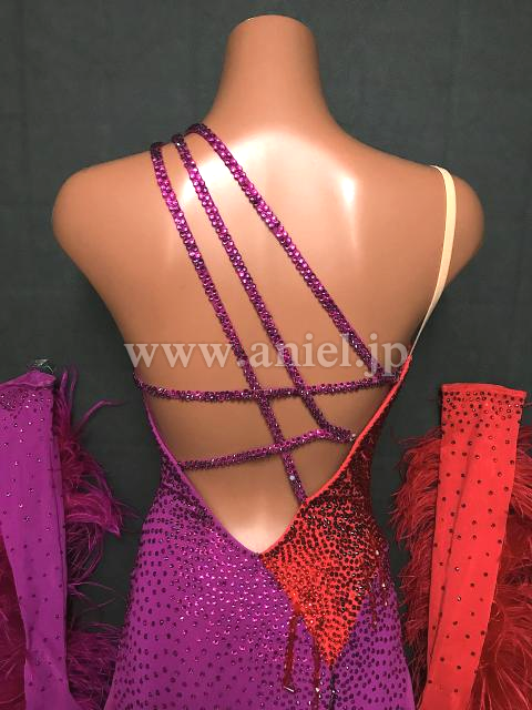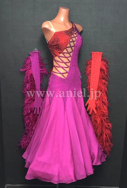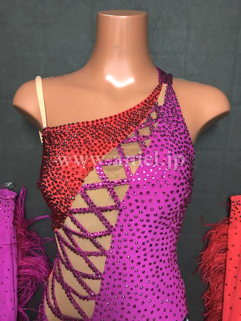 マゼンダピンクと赤のバイカラーが目を惹く他と被らないドレスです。