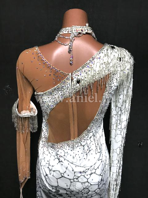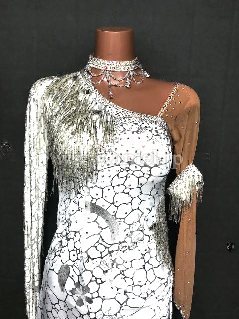 白の柄生地が個性的なドレスです。